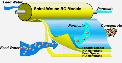 در سيستم اسمز معکوس، جريان ورودي يا خوراک (Feed) به دو جريان آب تصفيه شده(Permeate) و پساب غليظ (Reject) يا (Brine) تبديل مي شود.